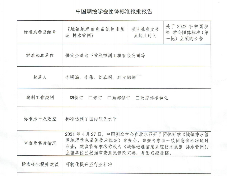 根據中國測繪學會《關于2022年中國測繪學會團體標準(第一批)立項的公告》,團體標準《城鎮排水管網地理信息系統技術規范》被列入立項計劃。