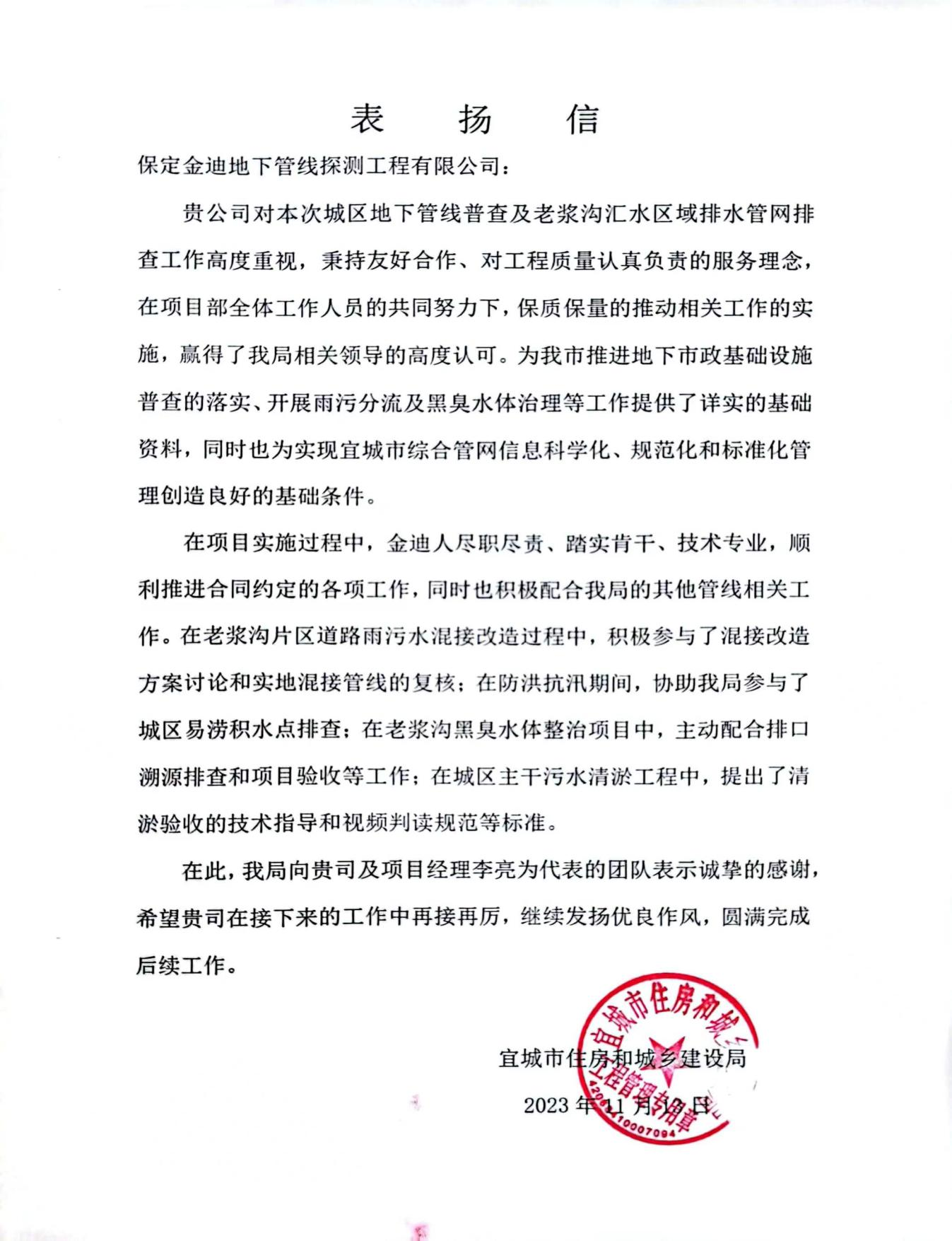 本次宜城市地下綜合管網普查及老漿溝匯水區域排水管網排查項目于2023年3月底進場,4月初開始施工,在項目全體工作人員的共同努力下,保質保量完成了各項工作內容,贏得了宜城市住房和城鄉建設局相關領導的高度認可。