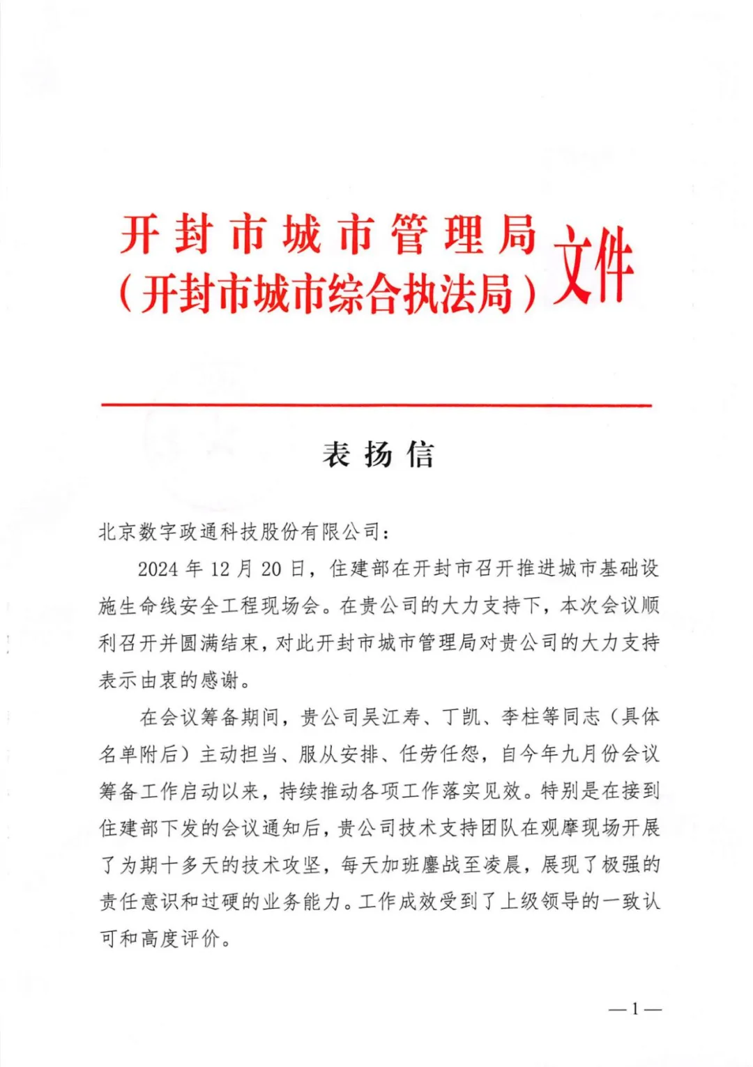 近日,數(shù)字政通收到來自開封市城市管理局的表揚信,充分肯定了公司在城市基礎(chǔ)設(shè)施生命線安全監(jiān)管平臺中的專業(yè)能力與服務(wù)質(zhì)量。這不僅是對數(shù)字政通深耕城市管理領(lǐng)域二十余年的高度認可,也是激勵我們再攀新高的前行動力。